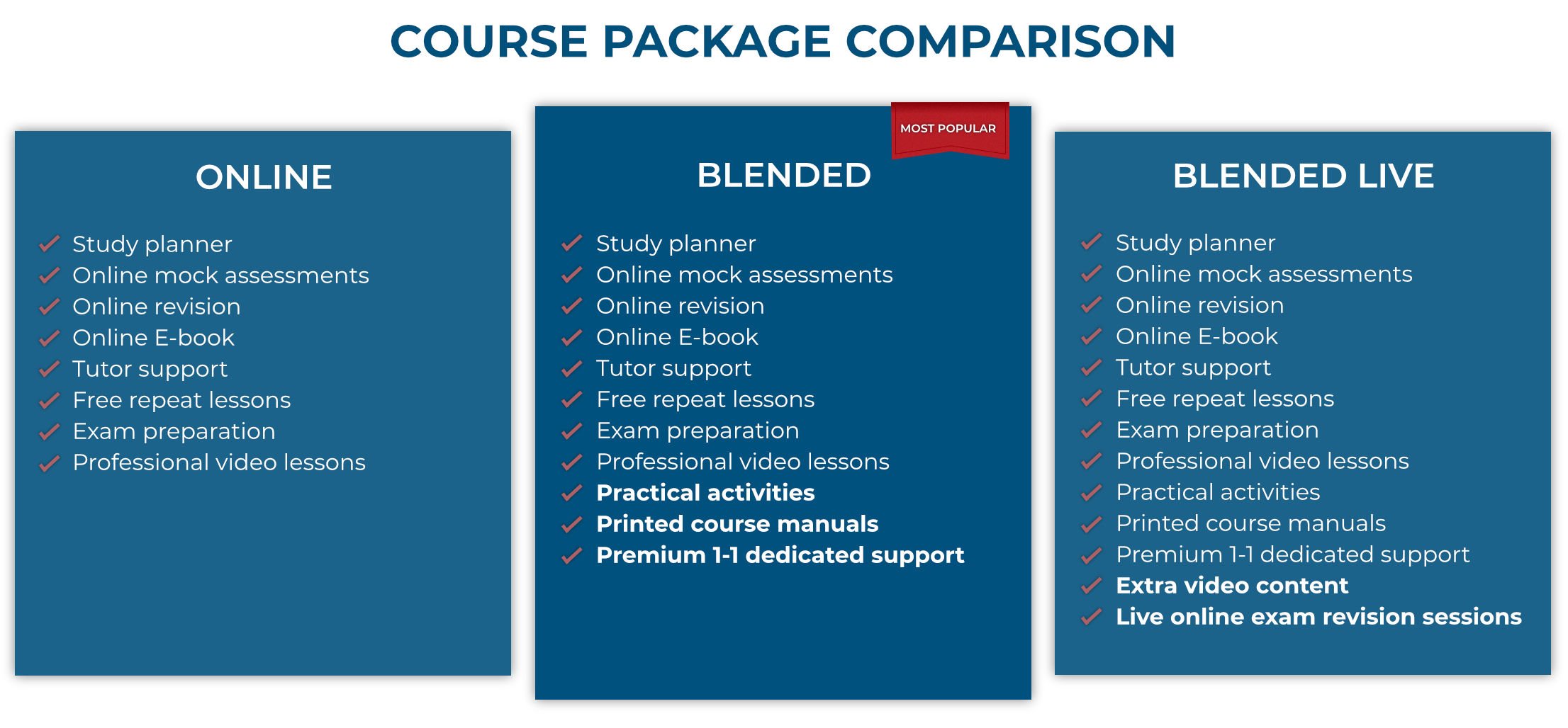 Includes everything from the Blended option and Live Online Exam revision sessions and an extra 52 hours of video content across levels 2, 3, and 4.
